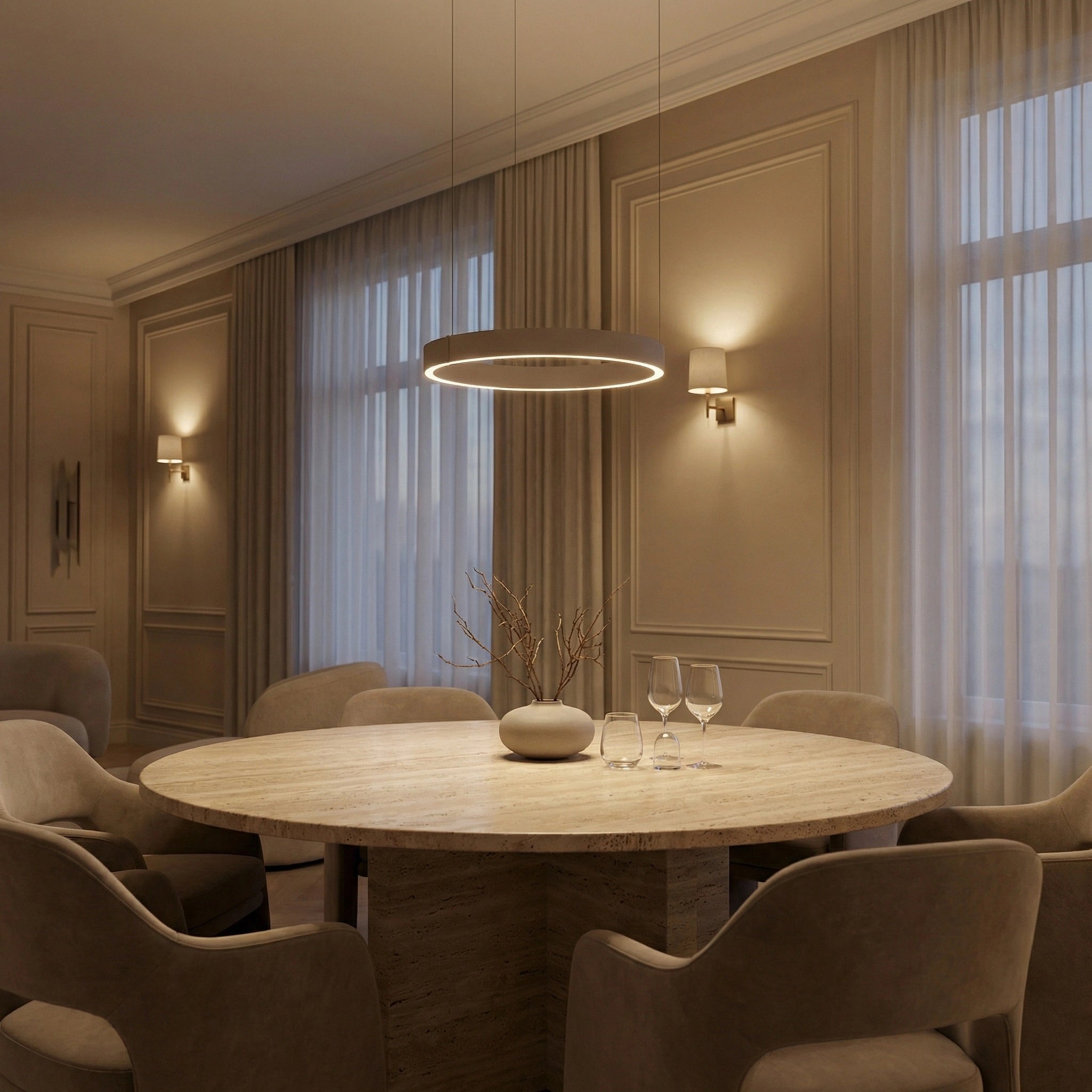 Eettafel is wel verlicht, maar nooit echt sfeervol. Een standaard plafonnière of spotrail maakt alles fel en vlak. Met de ringvorm krijg je een zachte, gelijkmatige gloed rond de tafel – genoeg licht om te zien wat je eet, maar zonder harde schaduwen.