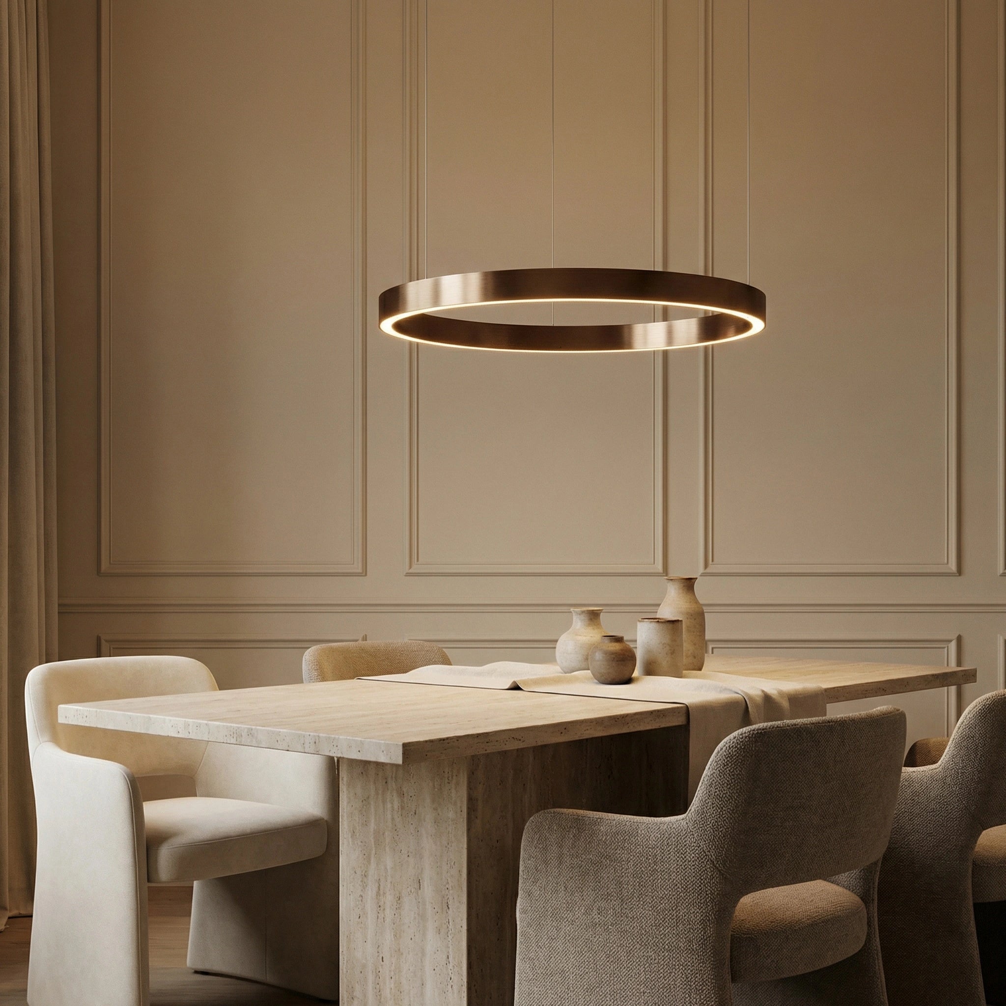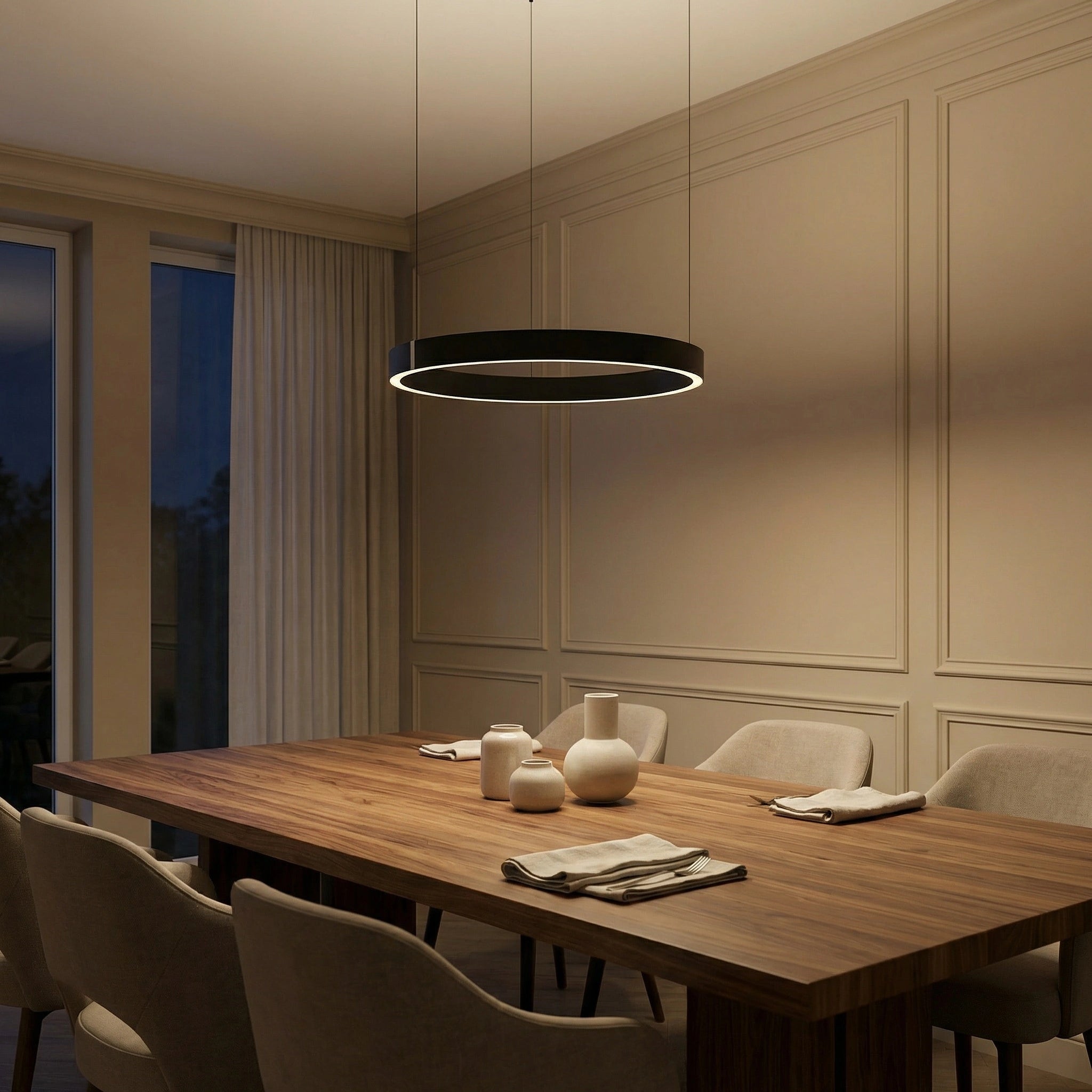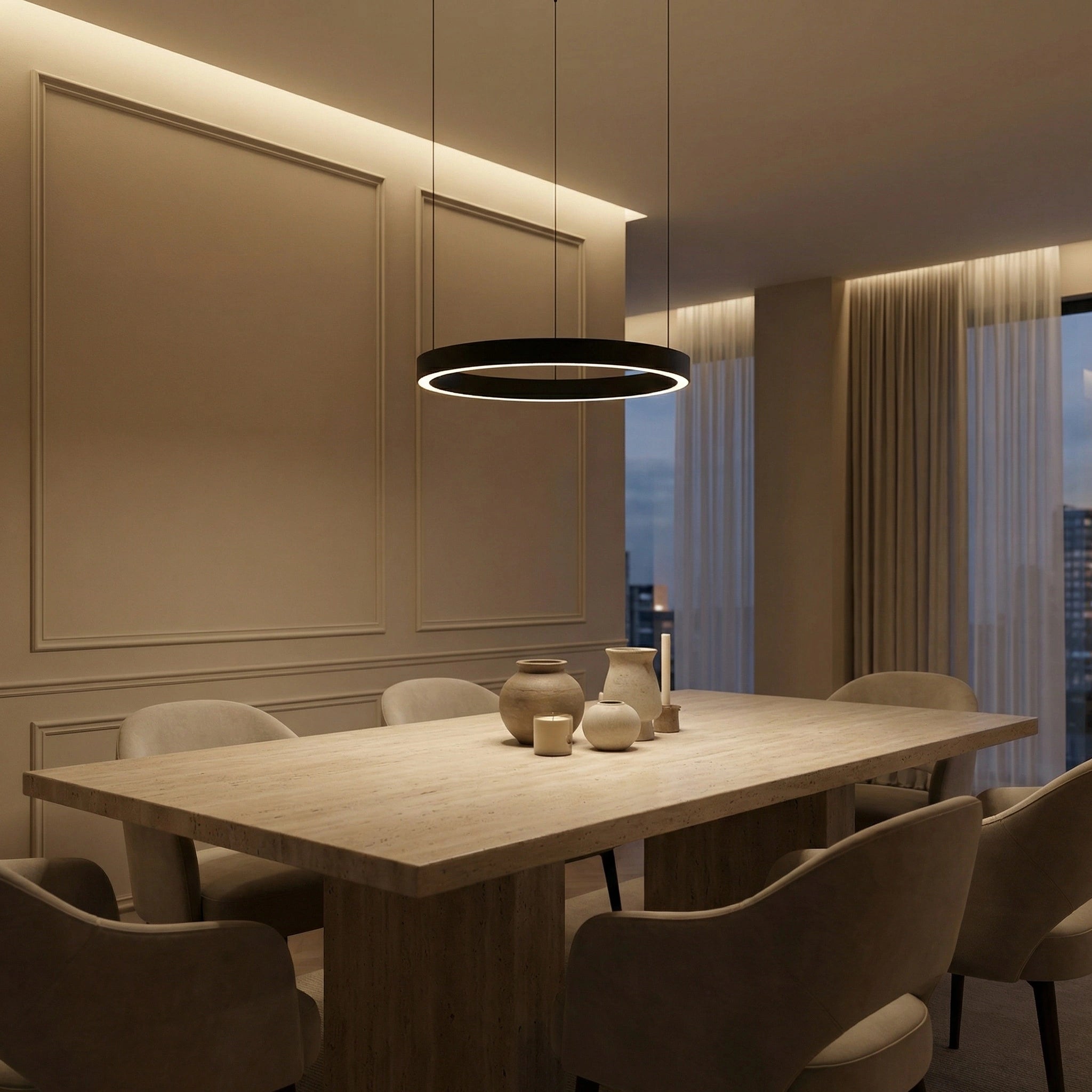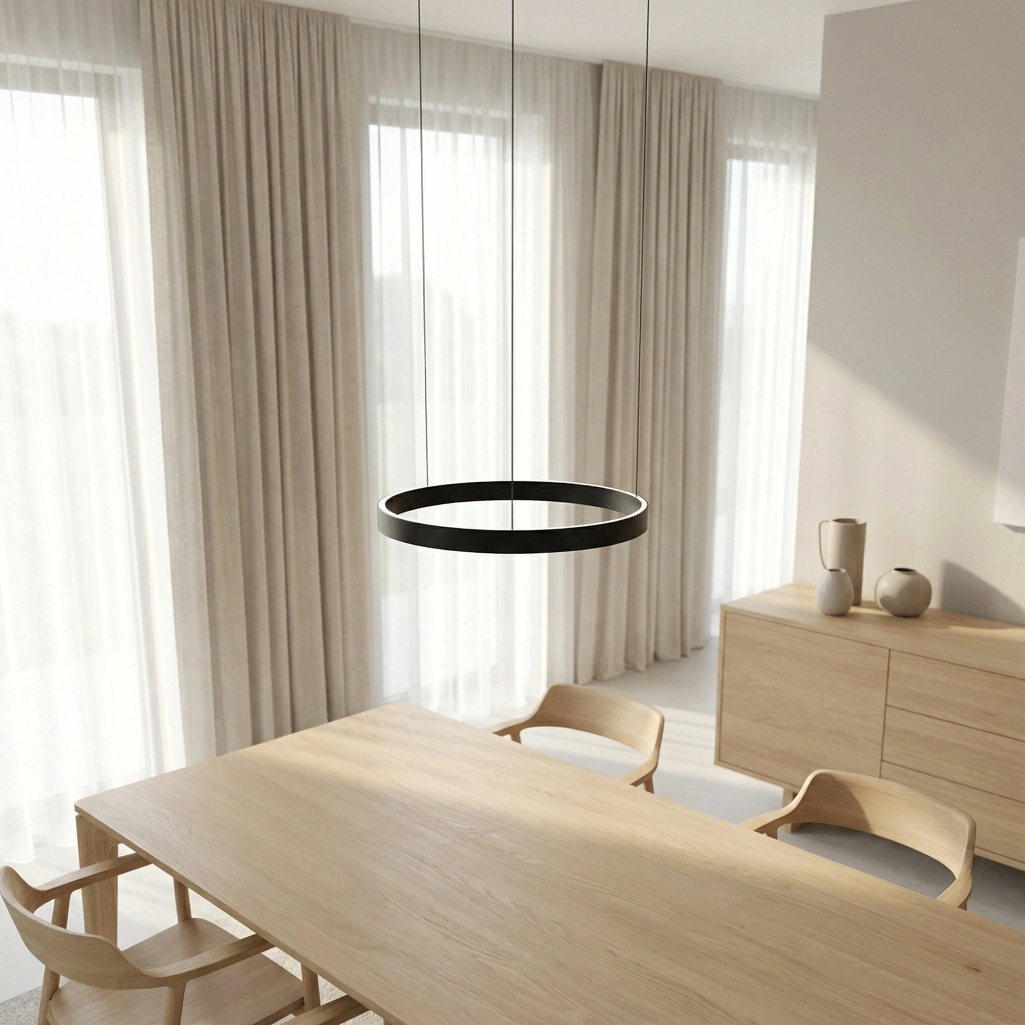 De Lucerna hanglamp combineert minimalistisch design met moderne LED-technologie en creëert een stijlvolle, rustige sfeer in elke ruimte. De slanke ring verspreidt licht zowel naar boven als naar beneden, waardoor een zachte en gelijkmatige verlichting ontstaat — perfect boven de eettafel of in de woonkamer.