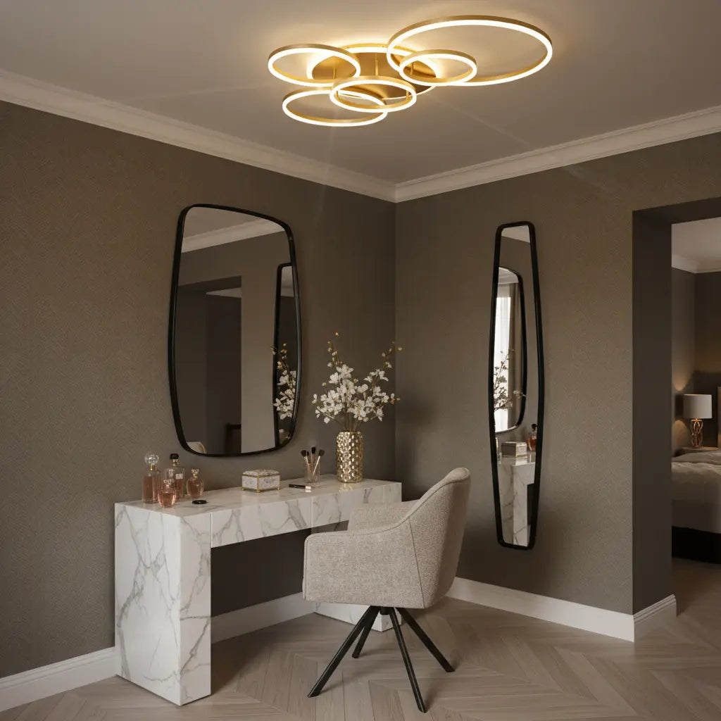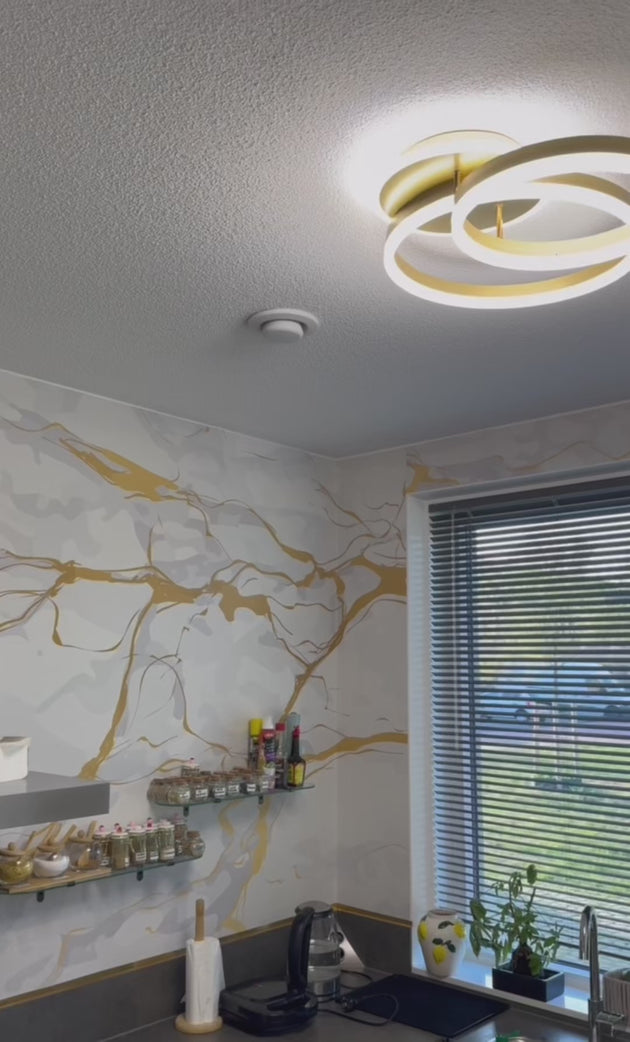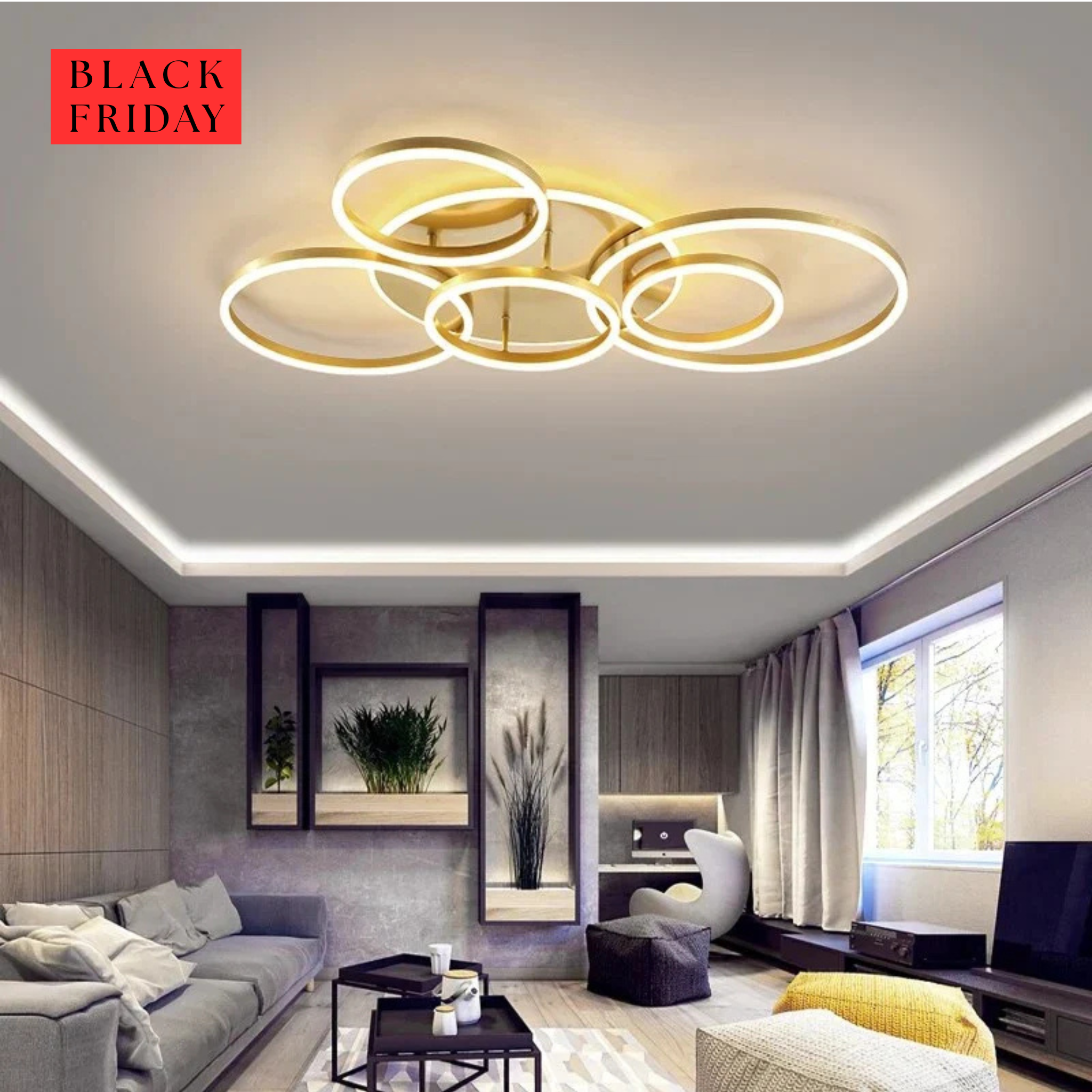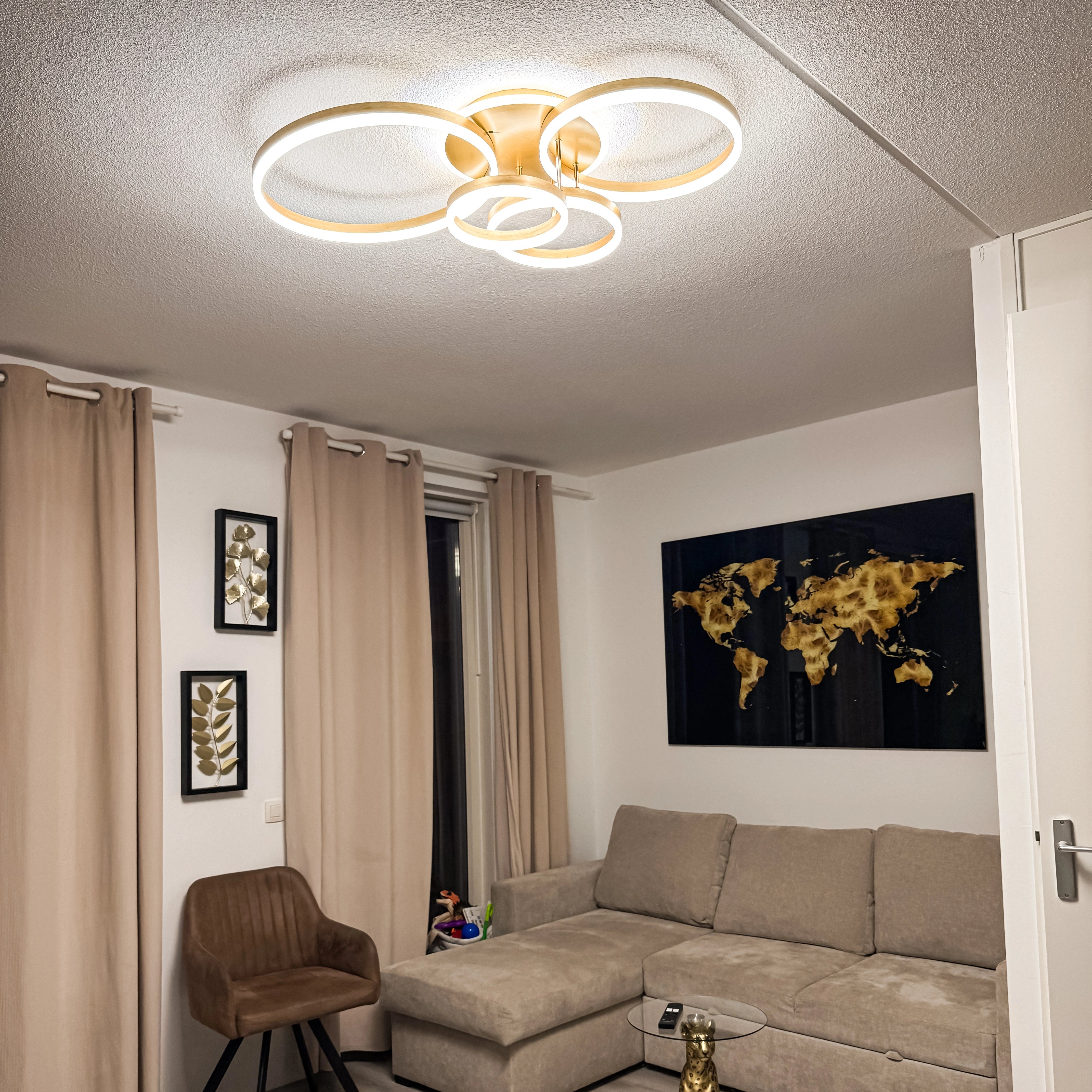 Deze moderne plafonniere is perfect voor het verlichten van grote ruimtes. Door de strak afwerkte goudkleurige ringen verlicht je jouw slaapkamer of woonkomer tot wel 25m².