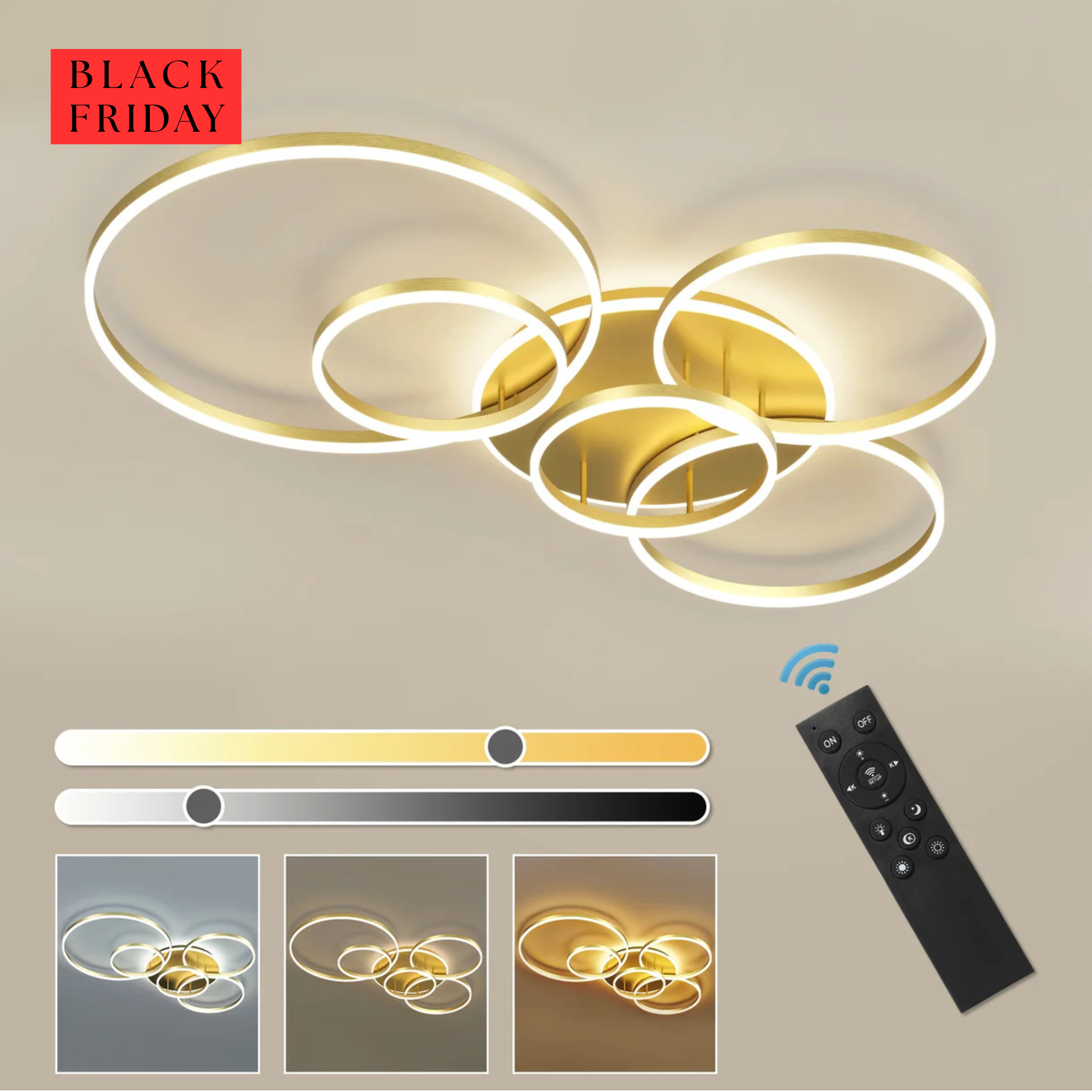 Deze luxueuze plafondlamp is verkrijgbaar met 5 of 6 dimbare LED-ringen. Verder wordt deze dimbare LED plafondlamp geleverd met afstandsbediening. Deze moderne plafondlamp is perfect voor het verlichten van grote ruimte. Door de strak afwerkte goudkleurige ringen tot wel 25 vierkante meter! Verder kan je gemakkelijk het licht afstellen op een prettige sterkte met de afstandsbediening. Hierdoor kan je meerdere effecten creëren die bij de stijl van jouw huis past. Deze goudkleurige LED plafondlamp met afstandsbediening is perfect voor in huis en geeft een wow-effect aan de ruimte.