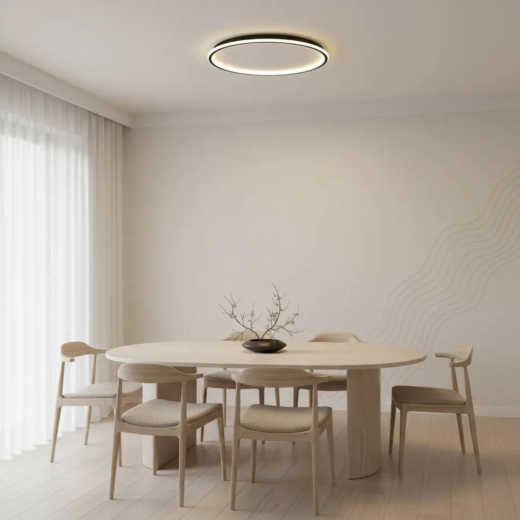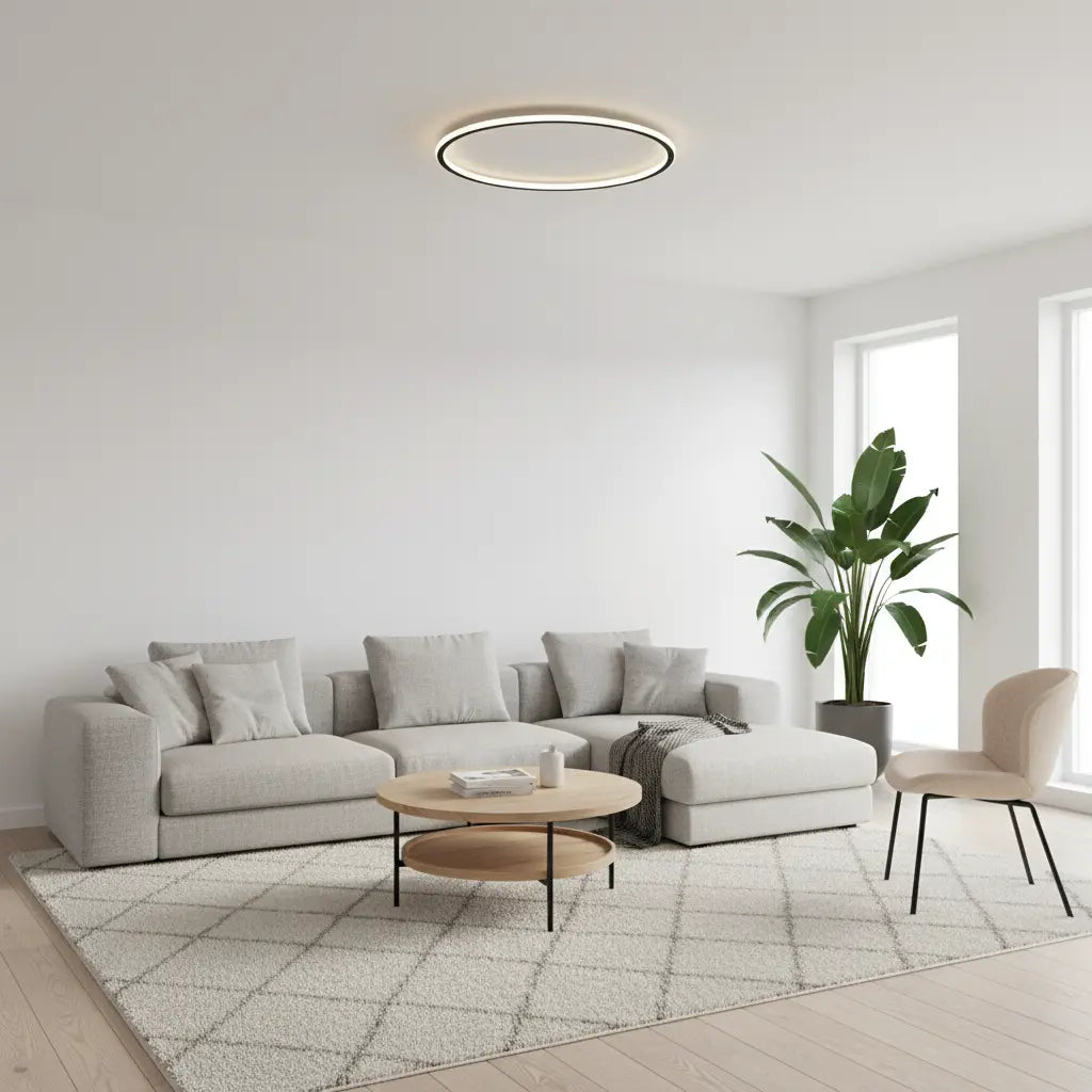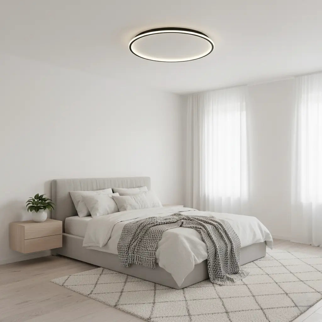 Strakke zwarte ronde plafondlamp met dimbare LED-verlichting, ontworpen voor stijlvolle en moderne verlichting.
