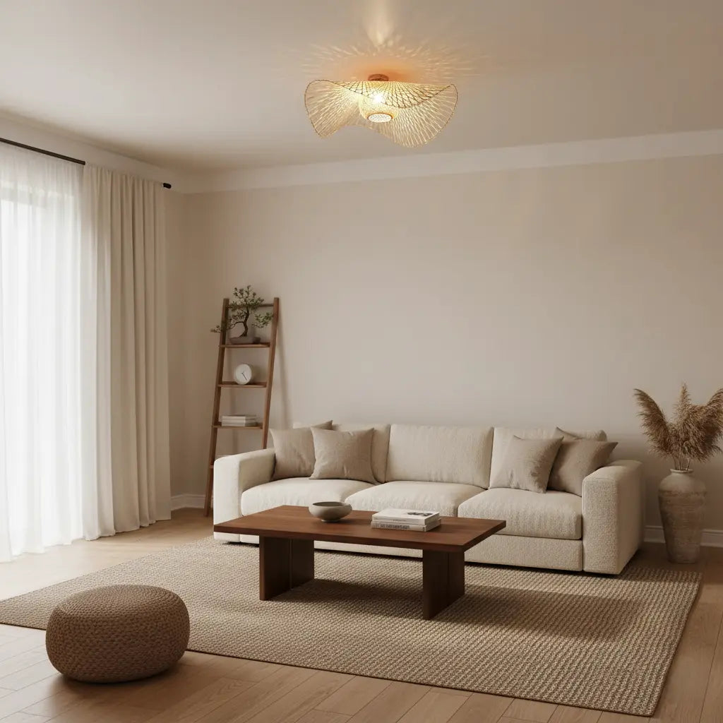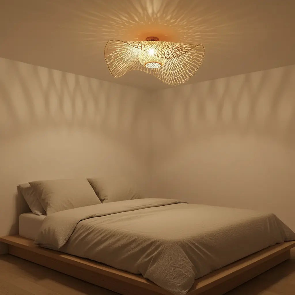 Natuurlijke bamboe plafondlamp voor een warme en sfeervolle uitstraling.