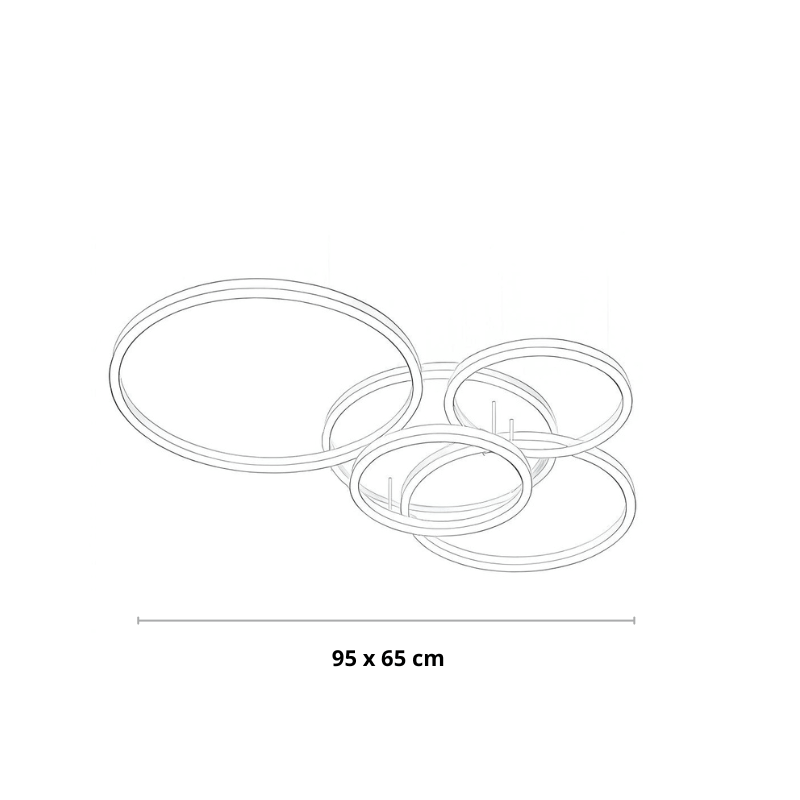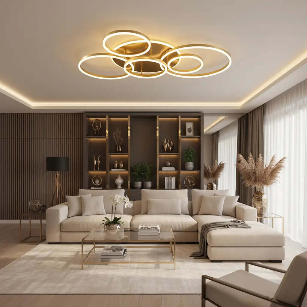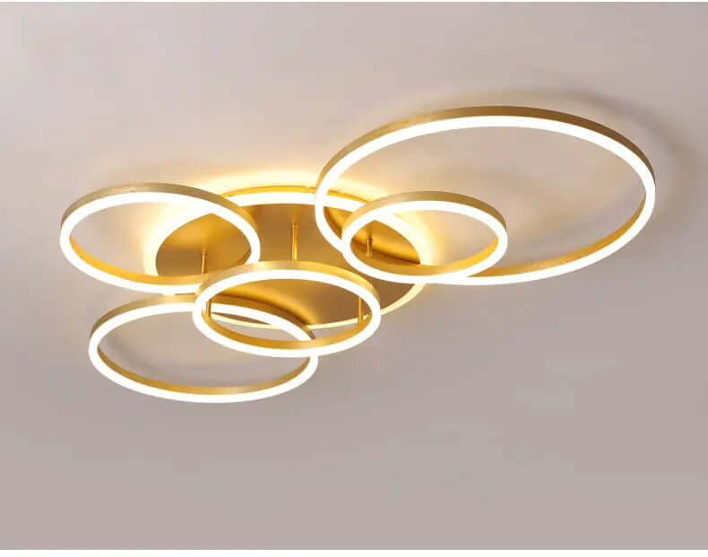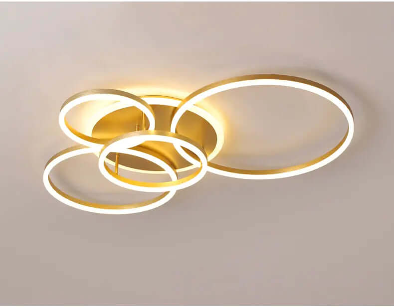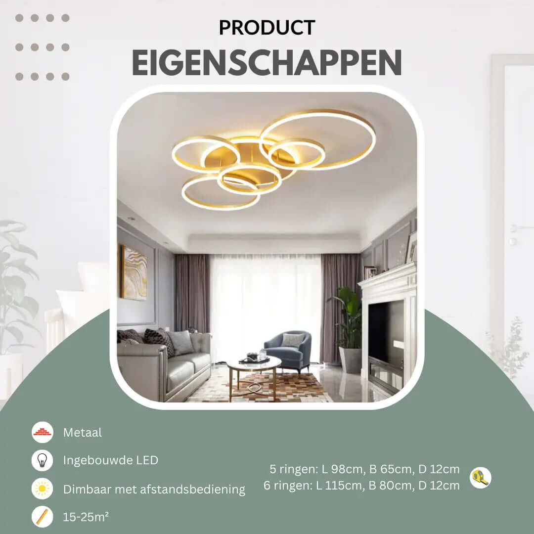 Deze moderne plafonniere is perfect voor het verlichten van grote ruimtes. Door de strak afwerkte goudkleurige ringen verlicht je jouw slaapkamer of woonkomer tot wel 25m².