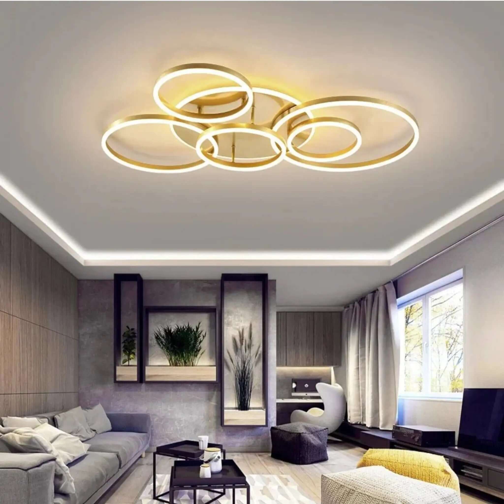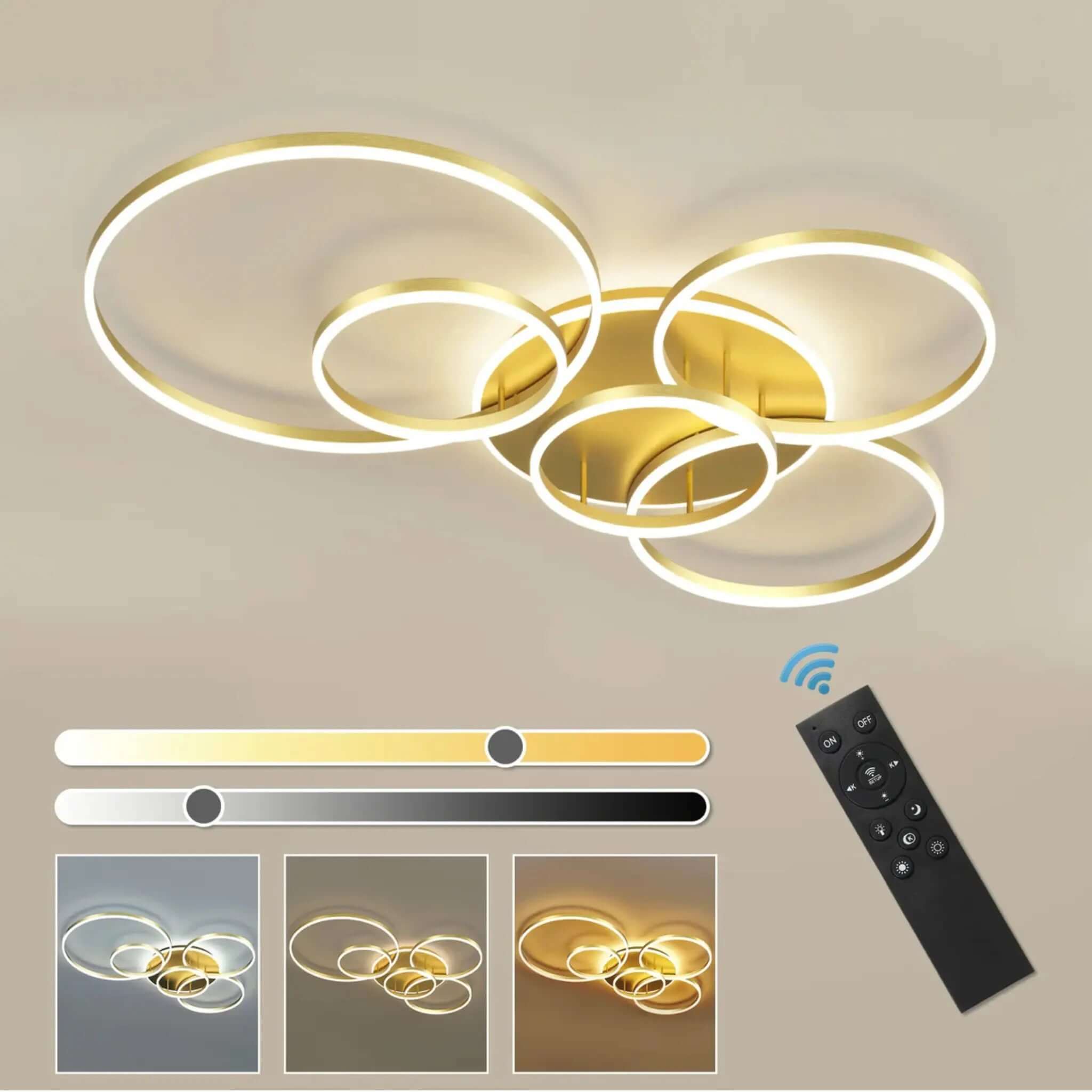 Deze luxueuze plafondlamp is verkrijgbaar met 5 of 6 dimbare LED-ringen. Verder wordt deze dimbare LED plafondlamp geleverd met afstandsbediening. Deze moderne plafondlamp is perfect voor het verlichten van grote ruimte. Door de strak afwerkte goudkleurige ringen tot wel 25 vierkante meter! Verder kan je gemakkelijk het licht afstellen op een prettige sterkte met de afstandsbediening. Hierdoor kan je meerdere effecten creëren die bij de stijl van jouw huis past. Deze goudkleurige LED plafondlamp met afstandsbediening is perfect voor in huis en geeft een wow-effect aan de ruimte.