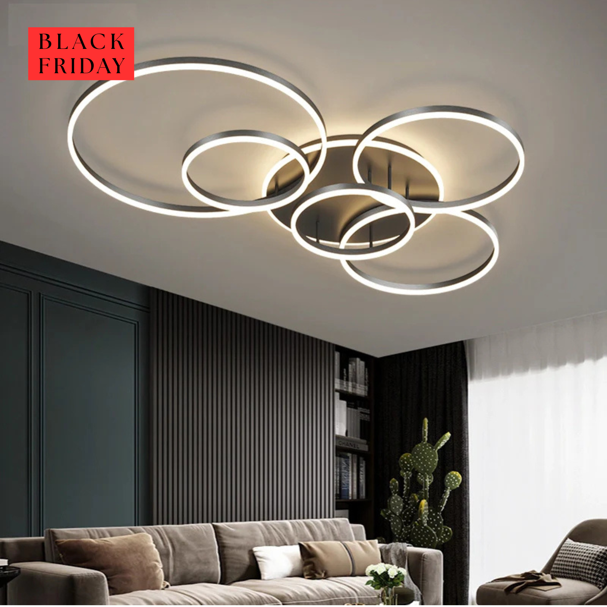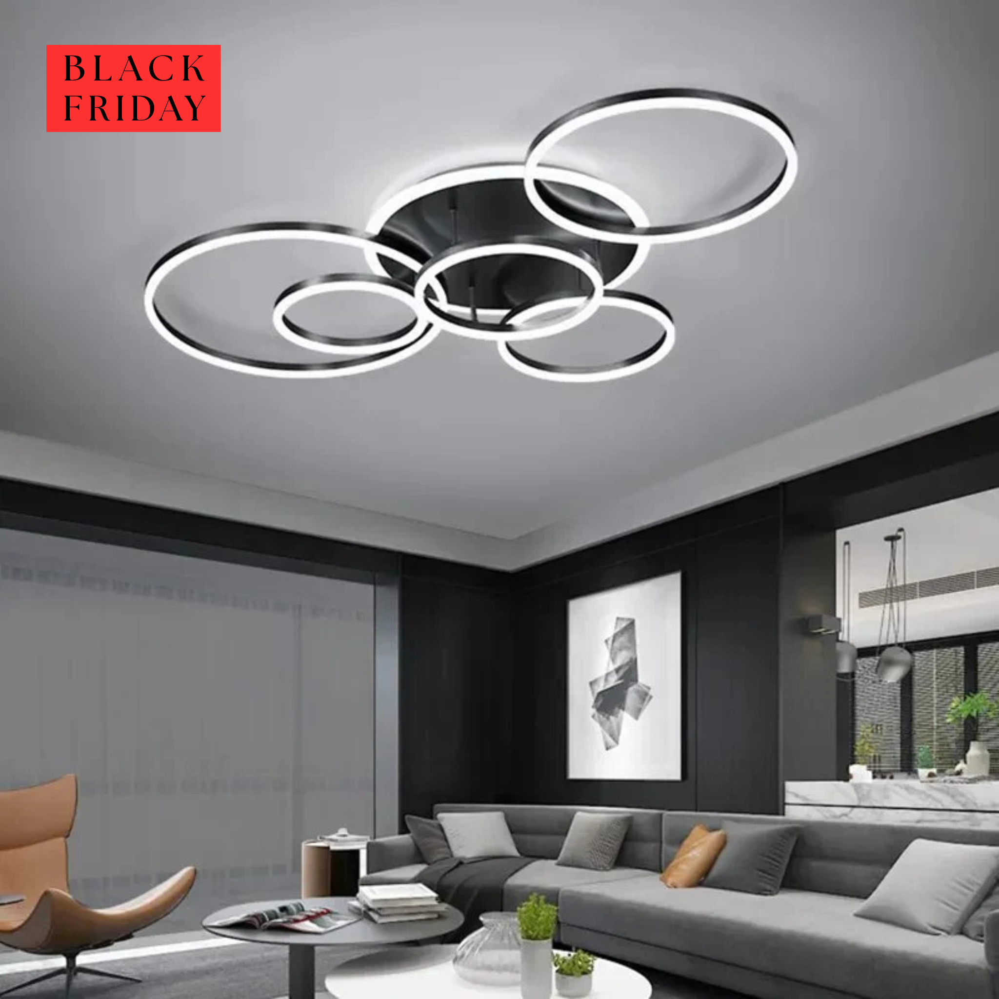 Deze moderne plafondlamp in het zwart is verkrijgbaar in twee varianten en met afstandsbediening.